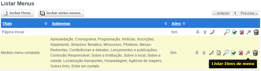 2. Em Listar Menus, localize na lista o Submenu que será alterado e clique na opção Listar Itens de menu ( ícone Listar Itens de menu) para visualizar os submenus separadamente;