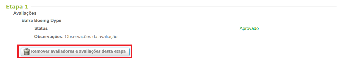 3.1. Na tela seguinte, role a página até Etapa 1. Se tiver avaliação registrada, clique em Remover avaliadores e avaliações desta etapa. Se houver Etapa 2 e Etapa 3, faça o mesmo processo para remover a avaliação nestas etapas.