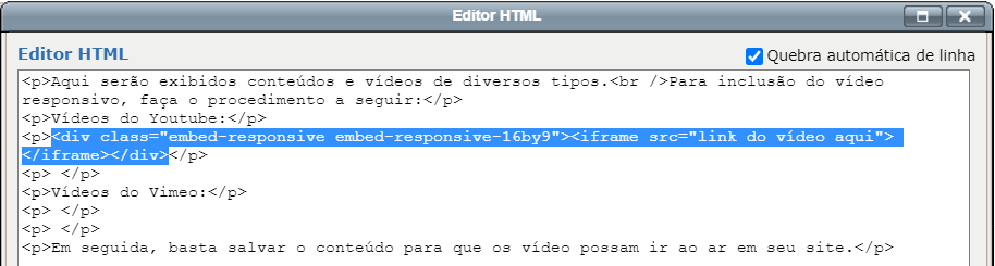 Dica: No editor de conteúdos comum, adicione algumas linhas em branco onde deverá aparecer o vídeo, isso facilitará a sua busca pois criará linhas apenas com os códigos: <p> </p>