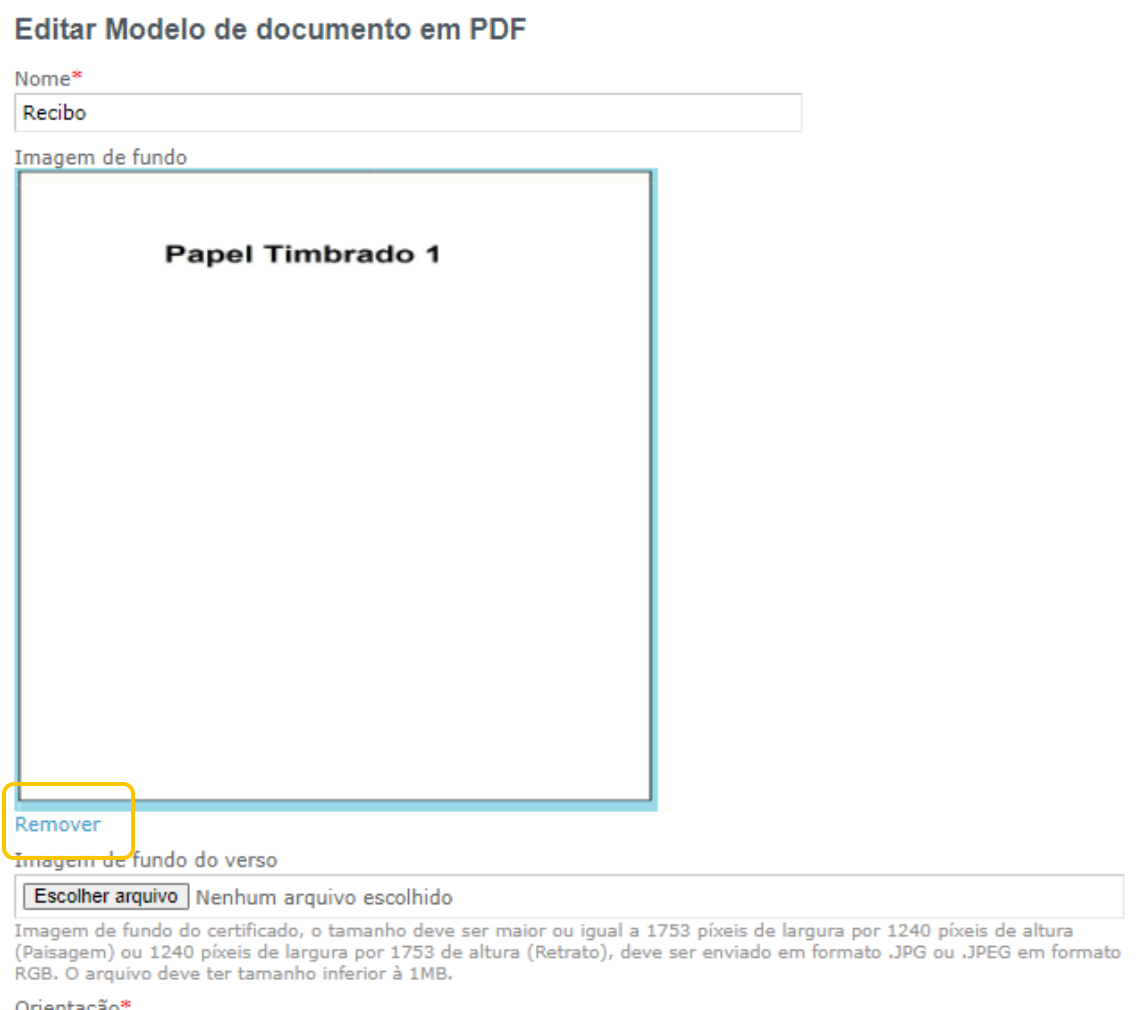 3. Identifique a opção "Remover" abaixo da imagem do papel timbrado atual e clique para excluir a imagem: