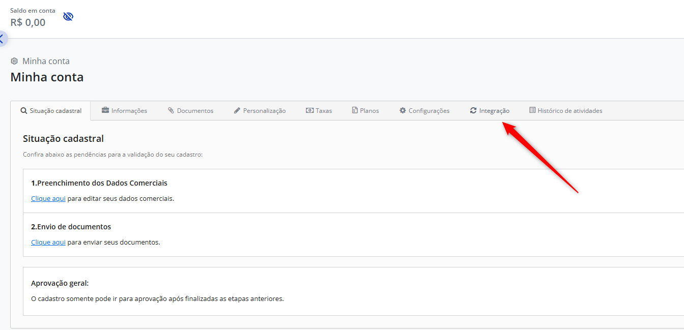 Na página “Minha conta”, clique na aba Integração.